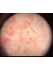 Paciente con Demodecidosis. Imagen ampliada de esta afección dermatológica.