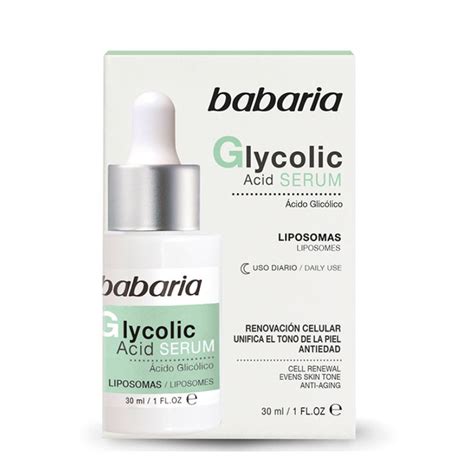 - Sérum con ácido glicólico de Babaria:"El sérum Glycolic Acid renueva y regenera la piel, unificando su tono", señala Babaria. Entre sus beneficios, este sérum facial fortalece la barrera cutánea, hidrata y ofrece un efecto antioxidante. Este sérum facial formulado con Ácido Glicólico libre y liposomado está especialmente diseñado para renovar y regenerar la piel unificando el tono. Además contiene Vitamina E que calma y previene irritaciones, fortalece la barrera cutánea y proporciona una profunda hidratación y efecto antioxidante. Su contenido en Ácido Glicólico actúa como peeling eliminando las capas superficiales de la piel y regulando la pigmentación. A su vez, ha sido formulado con Bisabolol, extracto de raíz de Jengibre y Esteroles para obtener mejores resultados