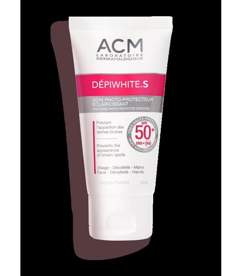 Laboratoire ACM Dépiwhite S Soin Photo-Protecteur Eclaircissant SPF50+ es un cuidado de la piel que ayuda a reducir las manchas pigmentarias causadas por el sol gracias a su factor de protección muy elevado y a su combinación de activos despigmentantes de origen vegetal. Esta crema solar también controla su reaparición.
