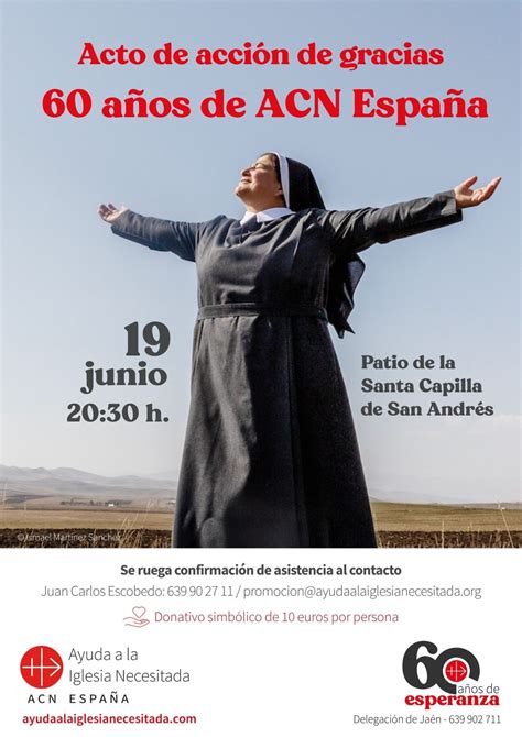 El jueves 19 de junio por la tarde tendrá lugar una oración de acción de gracias en Jaén, junto a nuestro Obispo, Don Sebastián Chico Martínez, con un pequeño ágape. La participación en esta celebración implica un donativo simbólico de 10 euros por persona, que se destinará íntegramente a apoyar a nuestros hermanos cristianos perseguidos y necesitados en distintas partes del mundo.