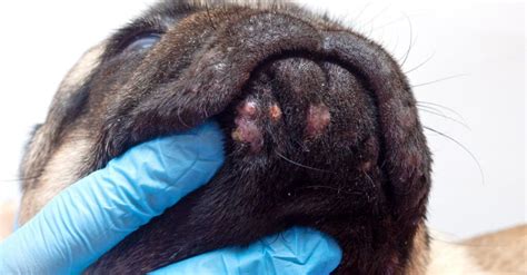 Es probable que reconozcas los granos con la vista. A menudo, se asemejan a los granos humanos y generalmente aparecen alrededor del hocico y los labios de tu mascota.