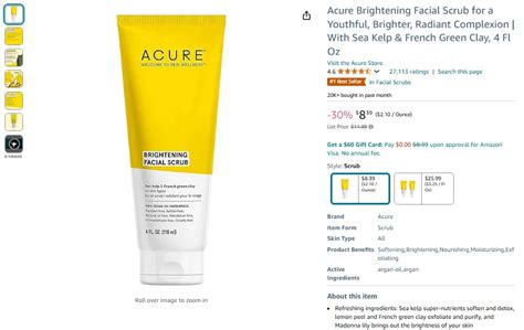Un ejemplo es el exfoliante facial ultrasuave Acure Organics. Elimina a fondo los residuos del rostro. Un ejemplo es el exfoliante facial clarificante Acure. Este producto ayuda a prevenir el acné y mantiene la piel limpia.