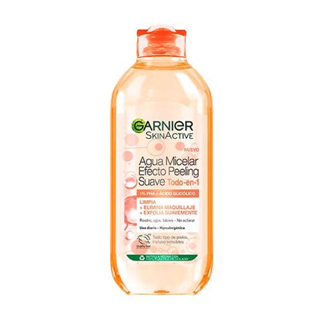 Un ejemplo destacado es el Agua Micelar Efecto Peeling Suave Todo en Uno de Garnier. Este producto combina la tecnología micelar con ingredientes exfoliantes para ofrecer una limpieza completa y delicada. Su fórmula avanzada contiene: