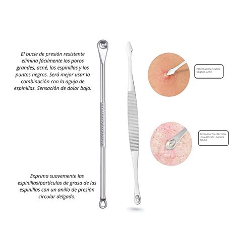 | Aguja saca espinillas | Eficaz, higiénico, rápido | Requiere cuidado y técnica | Desinfectar, no presionar en exceso |