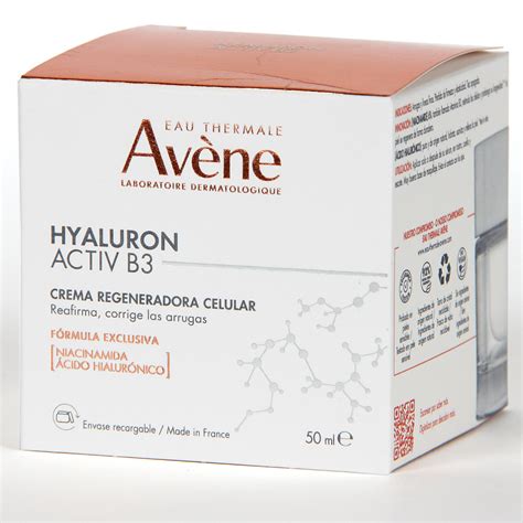 Avene Hyaluron Activ B3 Crema Regeneradora Celular 50ml es una crema rica en niacinamida y ácido hialurónico que corrige y suaviza las arrugas, dejando una tez aterciopelada, luminosa y alisada de inmediato. Es confortable y excelente como base de maquillaje, adecuada para todo tipo de pieles, incluso las sensibles.
