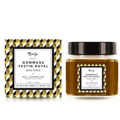 Baïja es una marca que nos invita a viajar a través de sus productos inspirados en rituales de belleza de los cuatro rincones del mundo. La gama Festin Royal, con su aroma a miel caramelizada, es una de las más queridas de la marca. Su packaging, con un diseño geométrico en blanco, caqui, amarillo y negro, es inconfundible.