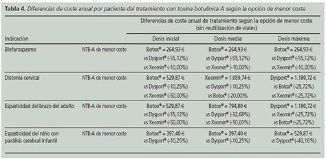 Considerando la reutilización de viales, el coste anual de tratamiento con NTB-A por paciente estaría comprendido entre 47,23 € y 2.237,22 €. Los costes por indicación, dosis y NTB-A se representan en la figura 2.