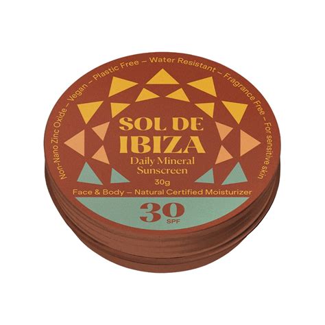 Los protectores solares Sol de Ibiza son productos de temporada. Protector solar natural mineral SPF30 - Sol de Ibiza. Protector solar para cara y cuerpo, apto para niños y adultos. Con aloe vera, cera vegetal y aceite de coco ecológicos. Un protector solar mineral contiene polvos minerales inertes que actúan como pantalla solar: partículas de óxido de zinc (no nano). Estos componentes tienen efecto «máscara» evitando que la radicación UV dañe nuestra piel. ¿Quieres saber más?