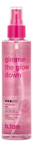| B.Tan Gimme The Glow Down | Bruma facial | Rápida absorción, pieles sensibles | Constancia requerida | Agua de rosas |