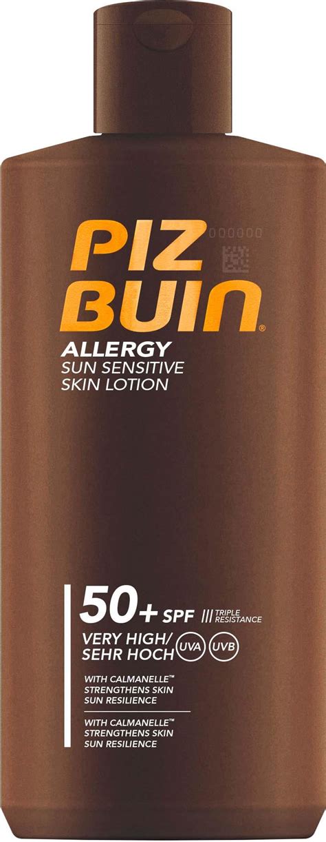 PIZ BUIN® Allergy Lotion ha sido especialmente desarrollado para pieles sensibles al sol porque se absorbe rápidamente y proporciona horas de humedad para calmar la piel sensible. Se trata de Allergy Loción FP50, crema protectora solar enriquecida en diversos antioxidantes y elementos minerales e hidratantes. Protección solar específica para los que padecen alergia o tienen una piel sensible.