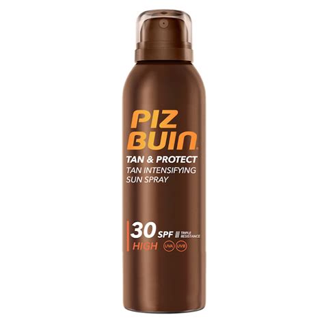 | Tan & Protect Spray | Piz Buin | Con una fórmula distintiva que acelera el bronceado mientras protege la piel, previene el fotoenvejecimiento. Su textura se absorbe de inmediato para un acabado natural y sedoso. |