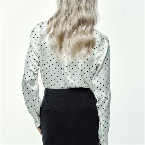 La tela de la camisa de lunares de Sfera tiene un brillo especial que, aunque esté confeccionada en poliéster 100%, simula la seda. Además, es fácil de cuidar, ya que se puede lavar en casa a una temperatura máxima de 30 grados y planchar a una temperatura inferior a 110 grados.