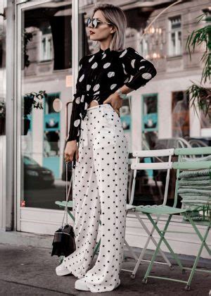 - Look de oficina: Si sueles llevar un pantalón de traje negro o azul marino, el pantalón de lunares negro y blanco es la alternativa más acertada. Combínalo con una camisa de algodón blanca o una blusa elegante. Un pantalón de vestir azul marino con lunares, blusa beige y blazer a juego. Zapatos de tacón bajo o mocasines completan el conjunto.