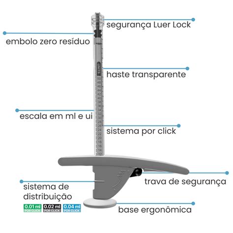 La jeringa Iclick® es una innovación que facilita la aplicación de la toxina botulínica con precisión y control. Con sistema de “click”, ella permite seleccionar dosis exactas (1, 2 o 4 UI por click), escalas en mL y UI, ergonomía aprimorada y agilidad en el procedimiento.