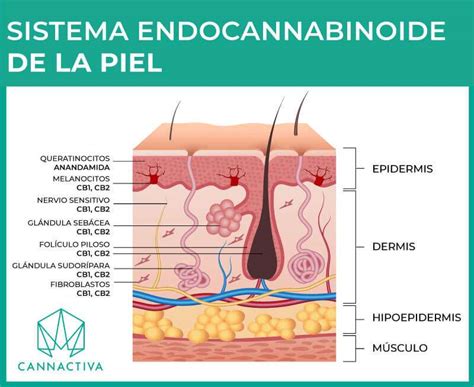 Más concretamente, los endocannabinoides están presentes en los queratinocitos y en los fibroblastos (fibras de la piel), y ejercen en efectos moduladores sobre estas células. Los receptores cannabinoides CB1 y CB2 están presentes en los queratinocitos, las fibras nerviosas cutáneas, los melanocitos, las glándulas sudoríparas y los folículos pilosos.