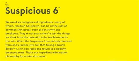 La piedra angular de la filosofía de Drunk Elephant es la eliminación de los "Suspicious 6", seis ingredientes que Masterson considera que son la raíz de muchos problemas de la piel. Iniciarse en ella es un Drunk Break y es lo más parecido a hacer un ayuno cosmético para dar a la piel solo lo que necesita para volver a un estado “más feliz y saludable”.