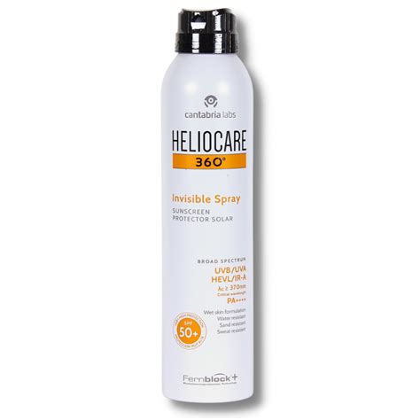 | Cantabria Labs Heliocare 360 Spray Invisible SPF50 | Todo tipo | Fernblock®+ | Protección completa, reparación del daño solar | Fácil aplicación, rápida absorción | Solo corporal, formato spray |