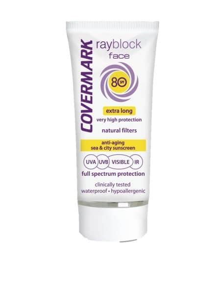 Rayblock Face SPF 80 de Covermark es un foto-protector facial extremadamente seguro, con una foto-estabilidad de 6 horas en la piel sin necesidad de reaplicación. Este protector solar cuenta con filtros naturales foto-estables que ofrecen una protección de amplio espectro frente a UVA/UVB/HE VISIBLE/ IR, durando al menos 6 horas después de cada aplicación.