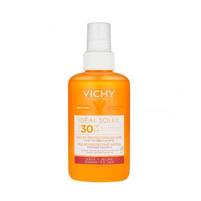 | Vichy Ideal Soleil Agua de Protección Solar SPF30+ Luminosidad | SPF 30+ | Beta caroteno, Tocoferol | Piel sensible | Hipoalergénico, favorece el bronceado |