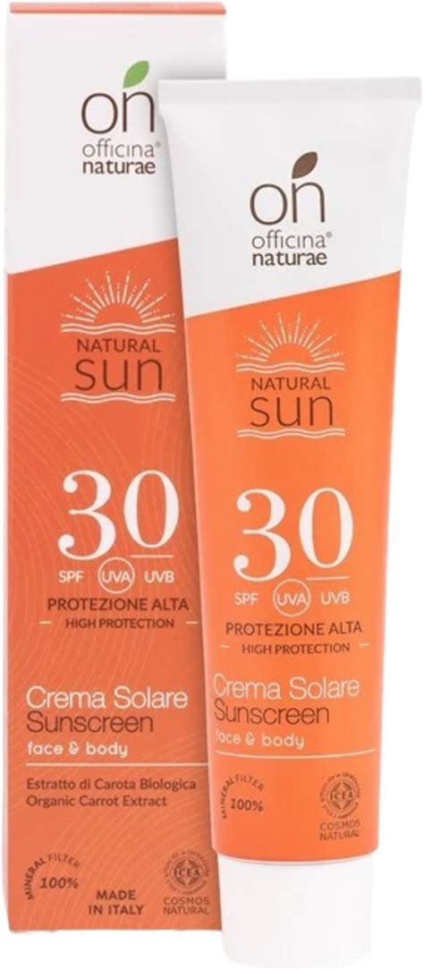 | Officina Naturae | Crema Solar SPF 30 | Alta protección certificada, filtros minerales y vegetales, previene el envejecimiento | Óxido de Zinc, Extracto de Pongamia, Extracto de Zanahoria |