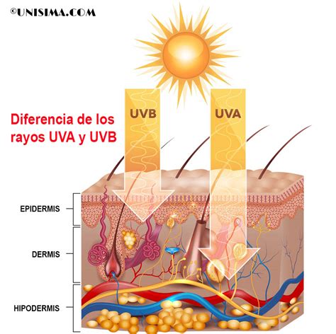 Los rayos ultravioleta A y B se diferencian por su longitud de onda: los UVA tienen una longitud de onda mayor y penetran más, mientras que los UVB tienen una frecuencia y energía mayor. Recibimos más cantidad de radiación UVA que de UVB (gran parte de la radiación UVB no nos alcanza por el efecto de la atmósfera).
