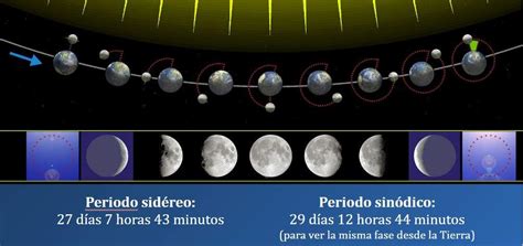 La Luna no tarda 28 días en dar una vuelta alrededor de la Tierra. El tiempo que transcurre entre una fase y la misma fase del siguiente ciclo lunar es de 29 d 12 h 44 min 2.8016 s de media. Esto es lo que se conoce como periodo sinódico o mes sinódico.