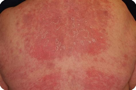 El lupus cutáneo subagudo es una erupción con llagas rojas en forma de anillo o parches escamosos con bordes distintos. La erupción comúnmente aparece en la espalda, el pecho y los brazos, pero a veces se extiende hasta los glúteos. Típicamente no afecta la cara ni al cuero cabelludo.