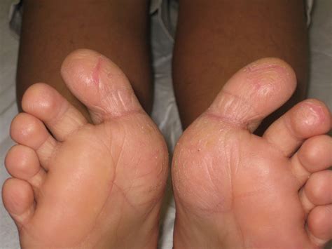 Se caracteriza por la inflamación de las plantas del pie y, en menor medida, de las palmas de la mano. Además, el prurito (picor) suele ser tan intenso, que se debe realizar diagnóstico diferencial con la tinea pedis (pie de atleta) y la psoriasis palmo plantar.