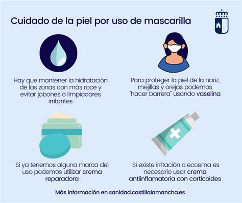 - Si se identifican problemas cutáneos con un tipo concreto de mascarilla, intentar usar otra similar (en cuanto a nivel de protección) de materiales diferentes.