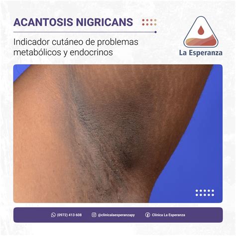 La acantosis nigricans es un signo cutáneo que puede señalar la presencia de una serie de enfermedades subyacentes. La acantosis nigricans o acantosis pigmentaria es una afección dermatológica caracterizada por la hiperpigmentación y engrosamiento de la piel, que aparece principalmente en las áreas del cuerpo con pliegues y arrugas, como los codos, las axilas o el cuello. La acantosis nigricans no es una enfermedad en sí misma, sino más bien un indicador de una posible alteración en el organismo.