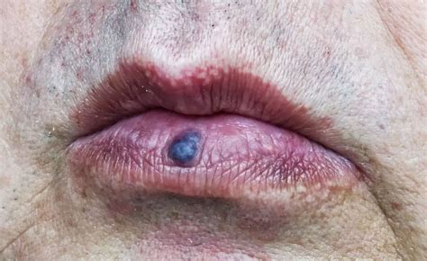 - Hay una única lesión en forma de pápula redondeada en un tono azul o violáceo.