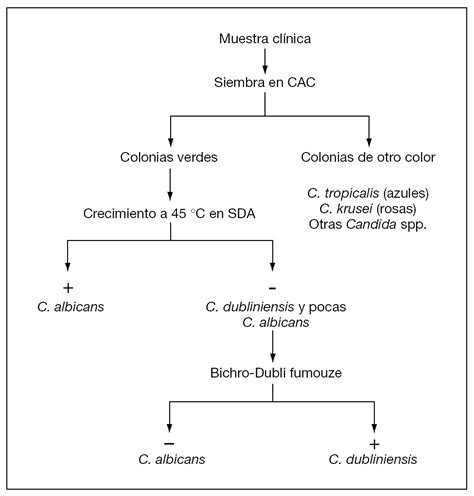 Según este algoritmo, las colonias de color verde en CHROMagar Candida se siembran a 45 °C en agar glucosado de Sabouraud durante 24 h y los aislamientos que no crezcan se consideran de forma presuntiva de la especie C. dubliniensis, realizándose la identificación definitiva con la prueba Bichro-Dubli®.