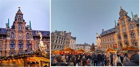 El Grote Markt, la plaza principal de Amberes y sus alrededores se transforman en un hermoso mercado de Navidad, con la catedral gótica, el Ayuntamiento y los edificios gremiales de fondo.