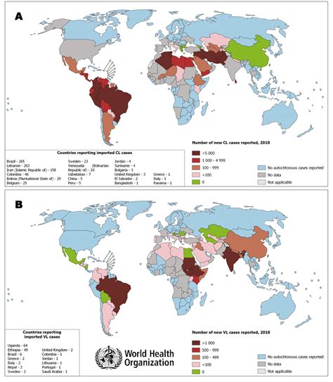 De los casos nuevos, una cuarta parte corresponden a formas viscerales. En el 90 % en la India, Nepal, Bangladesh, Brasil y Sudán. De las formas cutáneas, el 90 % ocurren en Afganistán, Arabia Saudí, Irán, Siria, Brasil y Perú, y las mucocutáneas se concentran en el 90 % en Bolivia, Brasil y Perú.