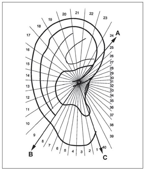 Sectograma auricular centrado en el punto cero de Nogier, que muestra las 3 líneas A, B y C que subdividen la aurícula