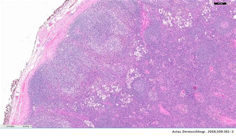 Los hallazgos histopatológicos son característicos: centros germinales ligeramente aumentados, rodeados por linfocitos, y la zona paracortical ensanchada. La zona paracortical aumentada presenta manchas pálidas debido a células de Langerhans y células dendríticas interdigitantes.