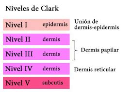 - Nivel de Clark: Describe la profundidad del tumor primario y la cantidad que ha penetrado en los distintos niveles de la piel.