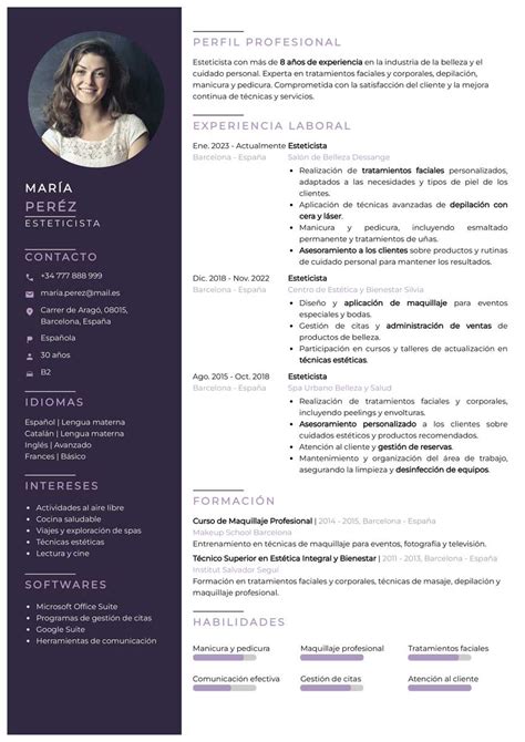 Al igual que en un tratamiento, la primera impresión en tu currículum es clave: tu resumen profesional debe captar la atención desde el inicio. En dos o tres frases, describe tu perfil con verbos activos y destaca tus especialidades en estética, incluyendo logros, experiencia y, si es posible, datos concretos como años trabajados o formación específica.