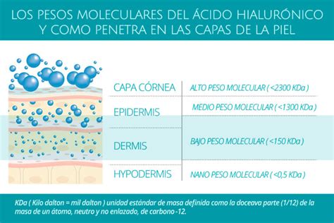 Por ejemplo, mientras el ácido hialurónico de alto peso molecular refuerza la capa más externa de nuestra piel de los agentes como la polución o el frío (mejora su función barrera aumentando la hidratación), el ácido hialurónico de bajo peso molecular tiene mayor capacidad de penetración en las capas más profundas de la piel. Es decir, al ser el tamaño de la molécula más pequeño, atraviesa mejor las capas de la epidermis.