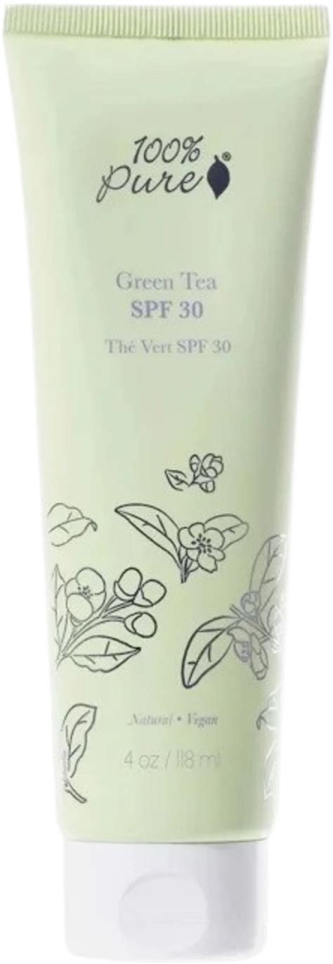 100% Pure Green Tea SPF 30 es una loción solar hidratante que protege la piel de los dañinos rayos UV del sol con protección SPF 30 mientras nutre la piel sedienta. La crema está elaborada con un filtro físico de óxido de zinc e ingredientes como té verde rico en antioxidantes, vitamina E, aloe vera y aceites como aceite de sésamo, aceite de aguacate, aceite de coco y aceite de oliva.