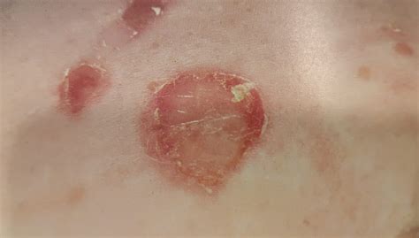El impétigo ampollar es similar, pero las vesículas suelen agrandarse rápidamente formando ampollas. Las ampollas se rompen y sus bases extensas quedan expuestas para luego cubrirse con una costra melicérica delgada.