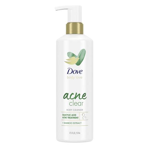 Nuestro gel Dove Body Love Acne Clear Body Cleanser está formulado con ácido salicílico y extracto de bambú para ayudar a eliminar el acné y prevenir la aparición de nuevas erupciones.