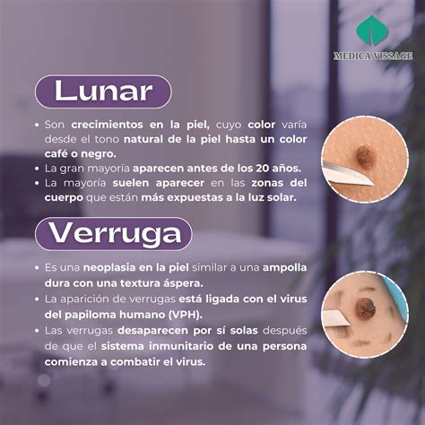 Los lunares son acumulaciones de melanocitos, las células que producen melanina (el pigmento de la piel). Las verrugas están causadas por una infección del virus del papiloma humano (VPH). Los lunares pueden ser marrones, negros, rojizos o del color de la piel. Las verrugas son grisáceas, amarillentas o del mismo tono que la piel. Las verrugas son más frecuentes en manos, pies, codos, rodillas, cara o zonas genitales.