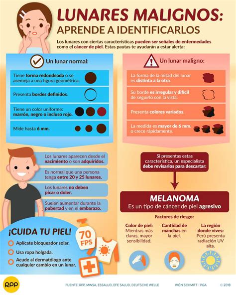 Un lunar puede ser un signo de cáncer de piel si tiene bordes irregulares o una forma asimétrica, o si cambia de color, forma, tamaño o relieve. Los lunares cancerosos, también conocidos como lunares malignos, cambian mucho de apariencia. Algunos pueden presentar todos los cambios mencionados antes.