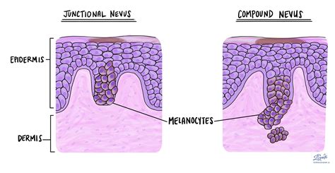 Cuando aparece un nevo melanocítico, las células se localizan entre la epidermis y la dermis (unión dermo-epidérmica) y se denominan nevus junturales. Acostumbran a ser lesiones planas de coloración marrón oscuro o negro. A medida que pasa el tiempo, los grupos de melanocitos (tecas) proliferan y se extienden hacia la dermis, denominándose nevus melanocíticos compuestos. Ocasionalmente pueden perder el componente juntural y localizarse exclusivamente en la dermis (nevus melanocíticos celulares, dérmicos o intradérmicos). Estas últimas lesiones suelen ser sobreelevadas y pueden perder completamente el pigmento.