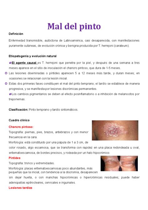 El mal de Pinto es una treponematosis no venérea que se manifiesta como una dermatosis crónica. Se diferencia de otras enfermedades causadas por especies de Treponema, como la sífilis, porque afecta exclusivamente la piel y no los órganos internos.