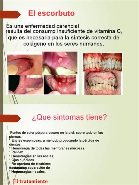 Los síntomas son: depresión nerviosa, piel amarillenta, tumefacción de las encías, hemorragias, dolores en las articulaciones y manchas en la piel que primero son rojas, se vuelven violáceas, verdes, verde-amarillentas y finalmente amarillas, debido a la alteración de los pigmentos de la sangre.