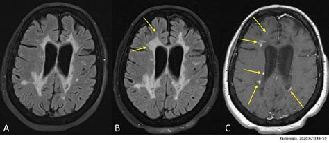 Imagen de resonancia magnética mostrando lesiones de esclerosis múltiple en el cerebro.