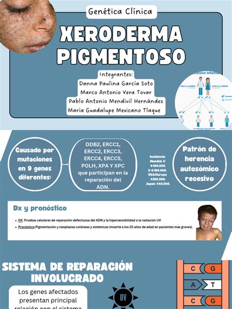 El xeroderma pigmentoso (XP) es una enfermedad muy rara con un patrón de herencia autosómico recesivo. Puede ser fatal, ya que causa una alta sensibilidad a la radiación ultravioleta (fotosensibilidad), lo que hace que las personas con el trastorno desarrollen tumores potencialmente malignos con mucha más frecuencia que la población normal. La piel también envejece rápidamente como resultado de este trastorno y puede decolorarse.