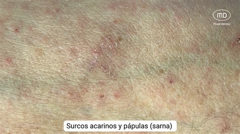 En resumen, la combinación del prurito y las lesiones elementales, configura una erupción con particularidades propias y altamente sugestivas de dicho diagnóstico. Cronológicamente, en el primer momento de la infestación, son las lesiones directas (vesículas y surcos) más fácilmente detectables.